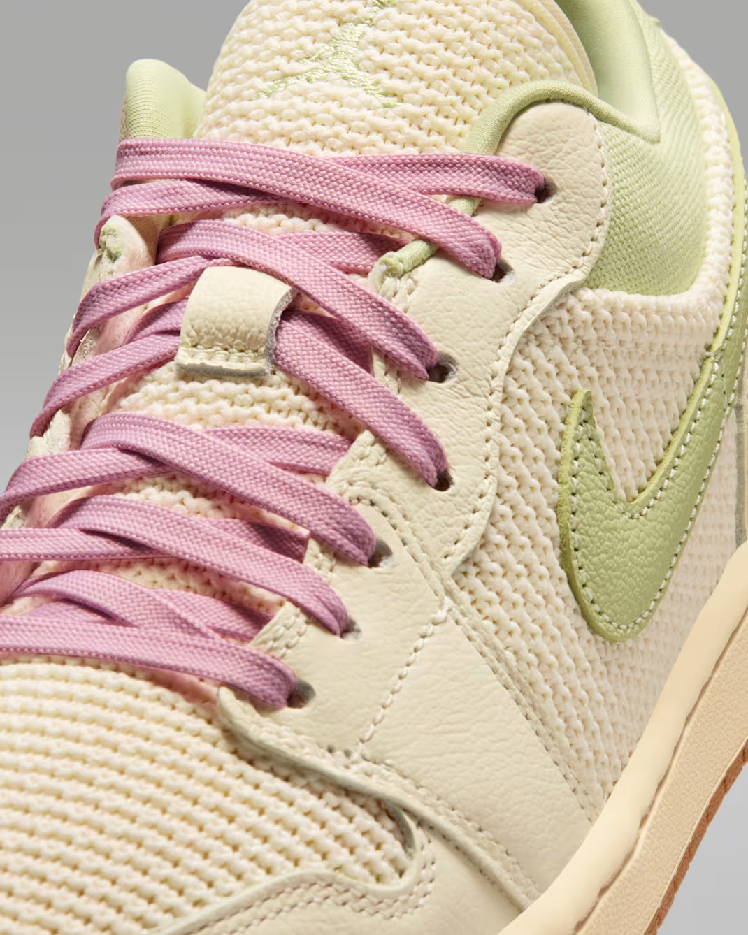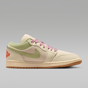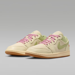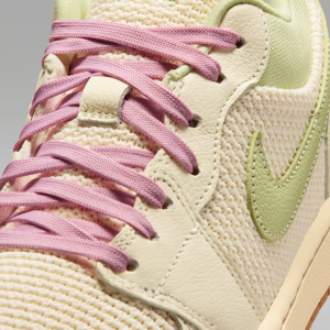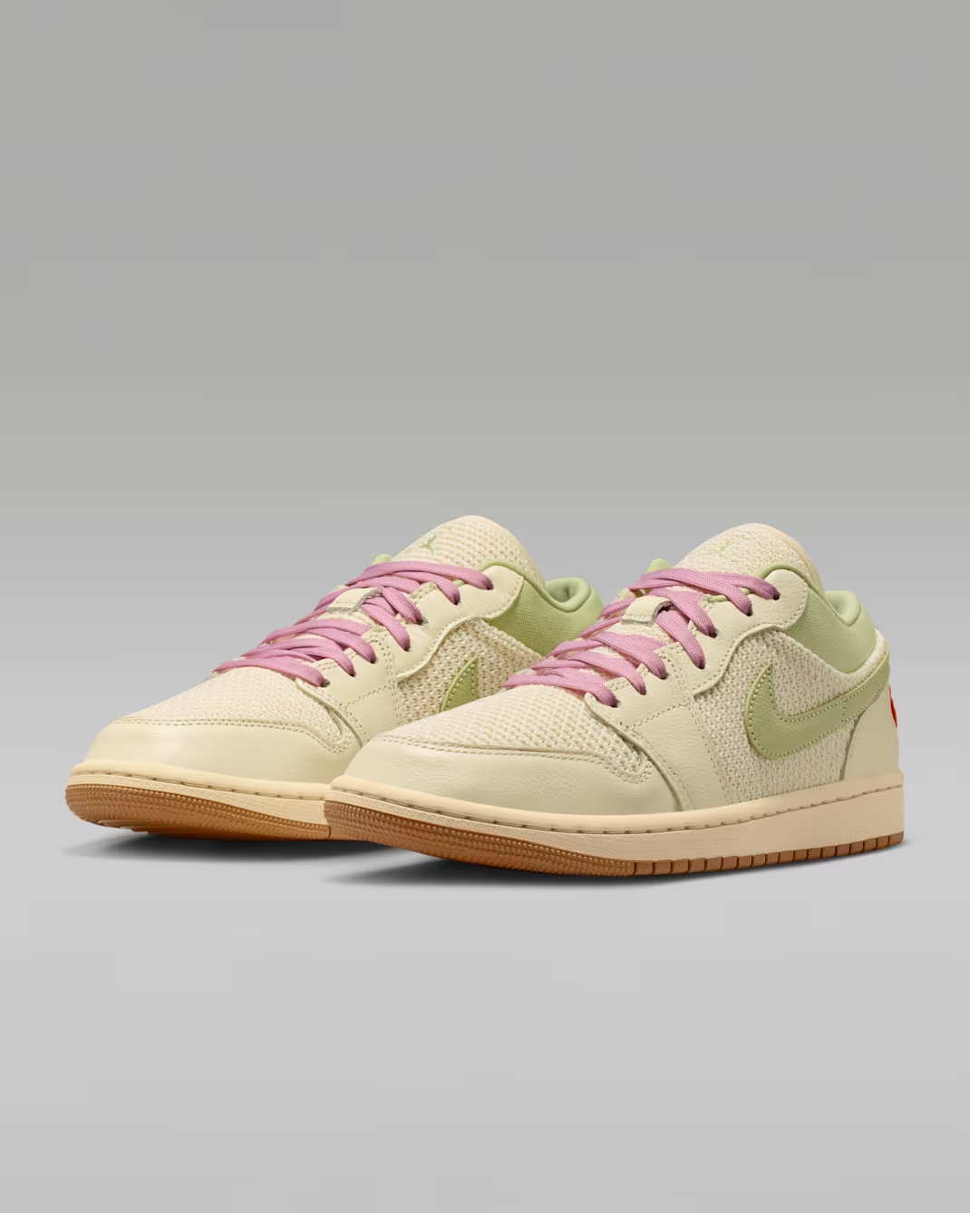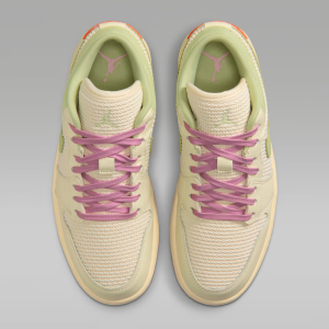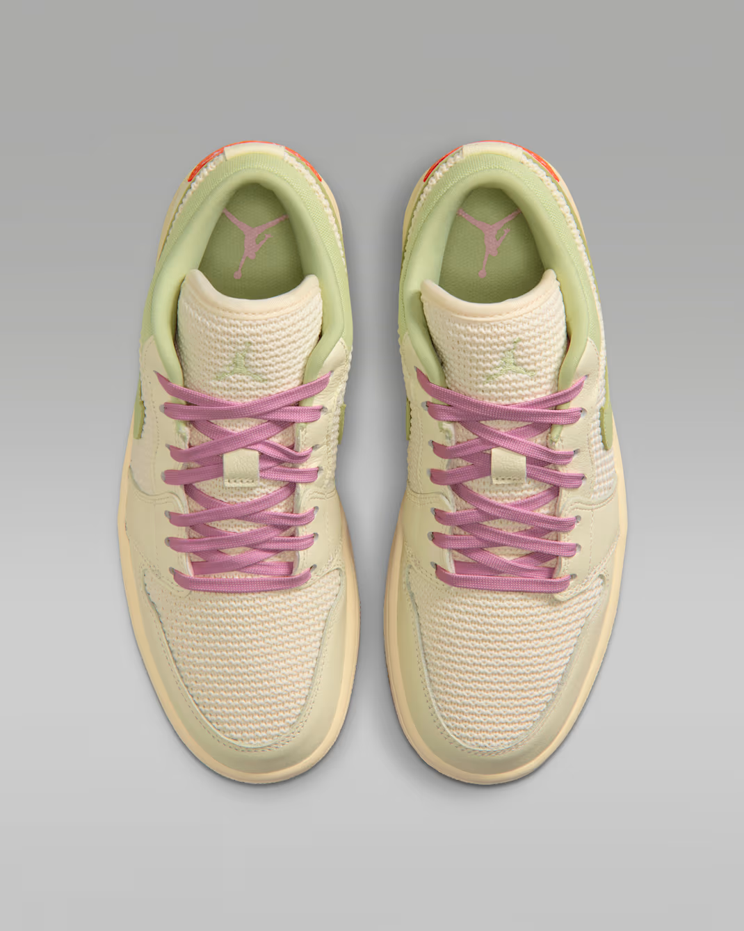 Điểm khác biệt lớn nhất của phiên bản Air Jordan 1 Low SE này chính là phần thân giày sử dụng các kết cấu vải dệt (woven textures). Sự thay đổi này không chỉ tạo điểm nhấn về thị giác mà còn mang lại cảm giác nhẹ nhàng hơn. Phối màu xanh cốm nhạt kết hợp cùng dây giày màu hồng tím tạo nên một tổng thể vô cùng hài hòa. Bạn sẽ cảm thấy vô cùng tươi mới và tràn đầy sức sống khi diện đôi giày này. Đây là lựa chọn lý tưởng cho những chuyến đi chơi hay dạo phố cùng bạn bè.